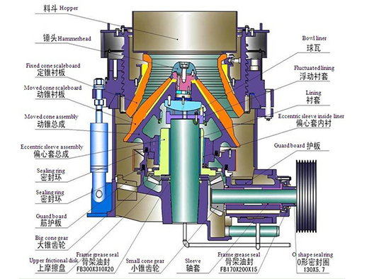 圆锥破碎机的主轴装入机架的锥形孔内,装有圆锥形齿轮的偏心轴套安装在主轴上,偏心轴套和主轴之间有青铜衬套,偏心轴套下端装有推力轴承,推力轴承有机架支承,破碎锥体套在偏心轴套上,安装在主轴上的碗形轴承架通过碗形轴瓦支承破碎锥,当偏心轴套转动时,带动破碎锥旋转作破碎运动。由于采用大直径主轴,为提高偏心轴套的转速提供了条件,偏心套转速的提高,大大增加了破碎冲击力,从而实现高能*。